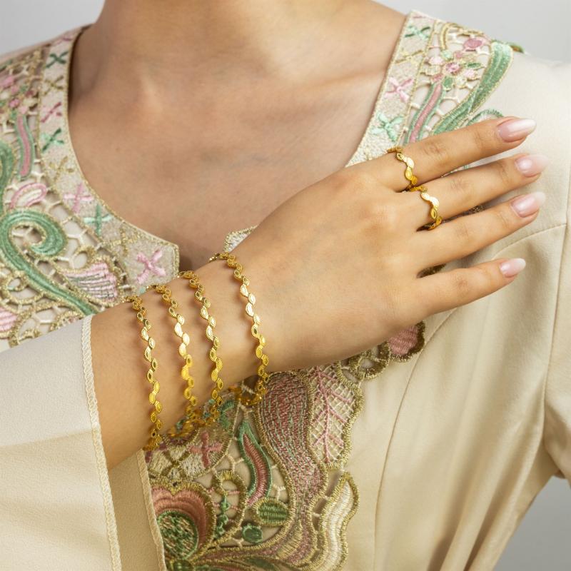 زيني معصمك وإصبعك بهذا الطقم الرائع من الأساور والخواتم، المطلي بالذهب أو الروديوم أو الذهب الوردي حسب اختيارك. هذا الطقم الرائع هو الإكسسوار المثالي لإضافة لمسة من الفخامة والأناقة إلى أي زي. سواء كنتِ تتأنقين لمناسبة خاصة أو ببساطة تضيفين لمسة من السحر إلى مظهرك اليومي، فإن هذا الطقم من الأساور والخواتم سيحقق بالتأكيد هدفك.