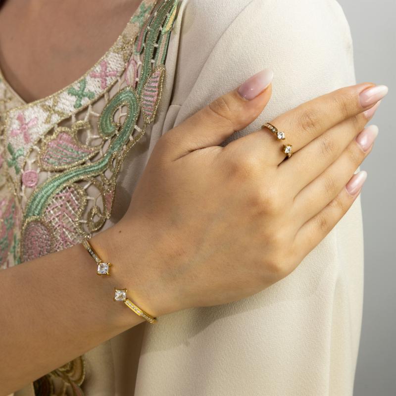 زيني معصمك وإصبعك بهذا الطقم الرائع من الأساور والخواتم، المطلي بالذهب أو الروديوم أو الذهب الوردي حسب اختيارك. هذا الطقم الرائع هو الإكسسوار المثالي لإضافة لمسة من الفخامة والأناقة إلى أي زي. سواء كنتِ تتأنقين لمناسبة خاصة أو ببساطة تضيفين لمسة من السحر إلى مظهرك اليومي، فإن هذا الطقم من الأساور والخواتم سيحقق بالتأكيد هدفك.