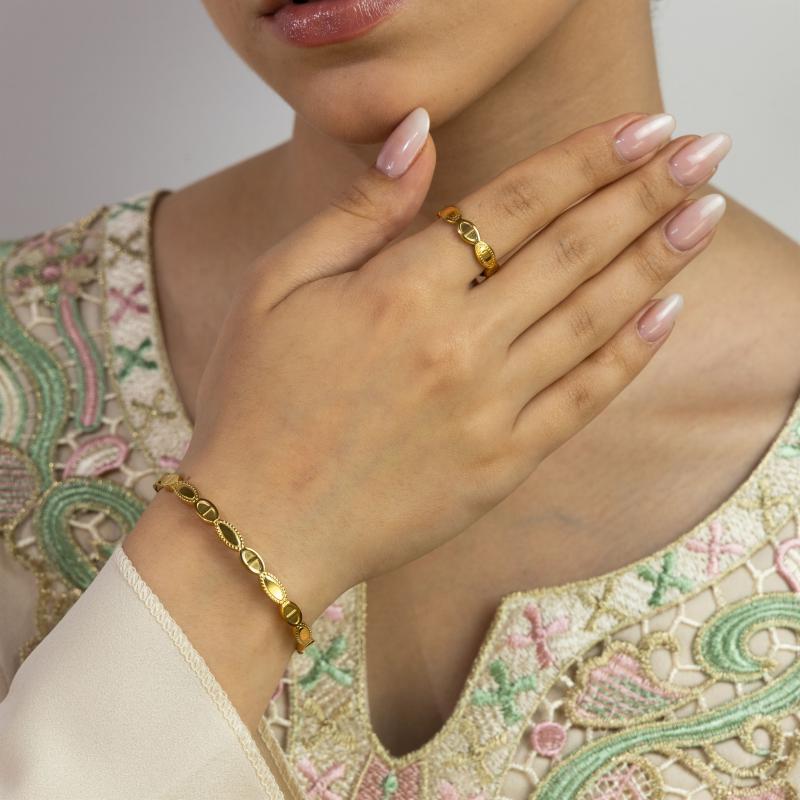 زيني معصمك وإصبعك بهذا الطقم الرائع من الأساور والخواتم، المطلي بالذهب أو الروديوم أو الذهب الوردي حسب اختيارك. هذا الطقم الرائع هو الإكسسوار المثالي لإضافة لمسة من الفخامة والأناقة إلى أي زي. سواء كنتِ تتأنقين لمناسبة خاصة أو ببساطة تضيفين لمسة من السحر إلى مظهرك اليومي، فإن هذا الطقم من الأساور والخواتم سيحقق بالتأكيد هدفك.