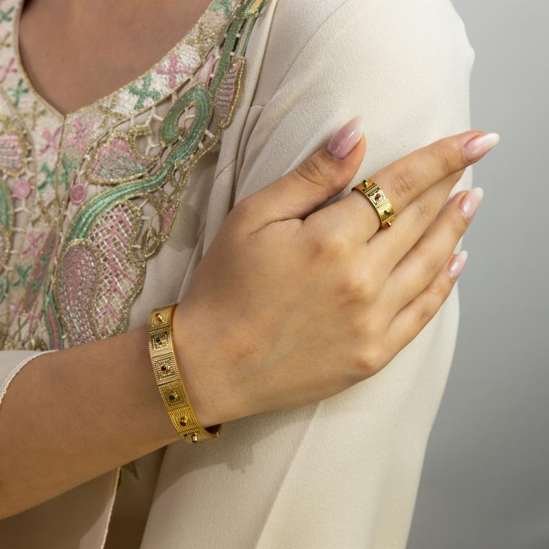 زيني معصمك وإصبعك بهذا الطقم الرائع من الأساور والخواتم، المطلي بالذهب أو الروديوم أو الذهب الوردي حسب اختيارك. هذا الطقم الرائع هو الإكسسوار المثالي لإضافة لمسة من الفخامة والأناقة إلى أي زي. سواء كنتِ تتأنقين لمناسبة خاصة أو ببساطة تضيفين لمسة من السحر إلى مظهرك اليومي، فإن هذا الطقم من الأساور والخواتم سيحقق بالتأكيد هدفك.