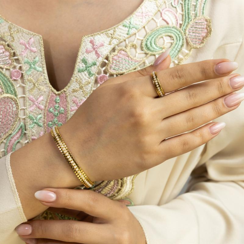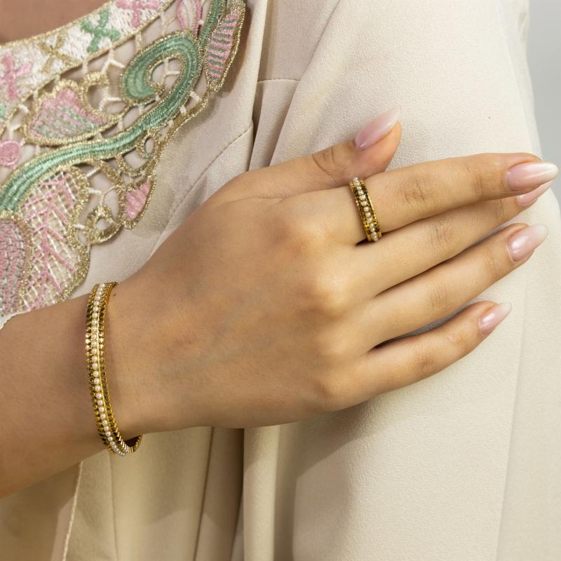 زيني معصمك وإصبعك بهذا الطقم الرائع من الأساور والخواتم، المطلي بالذهب أو الروديوم أو الذهب الوردي حسب اختيارك. هذا الطقم الرائع هو الإكسسوار المثالي لإضافة لمسة من الفخامة والأناقة إلى أي زي. سواء كنتِ تتأنقين لمناسبة خاصة أو ببساطة تضيفين لمسة من السحر إلى مظهرك اليومي، فإن هذا الطقم من الأساور والخواتم سيحقق بالتأكيد هدفك.