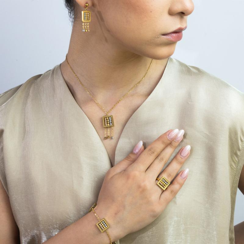طقم كامل بإطار مربع ذهبي وخرز ملون