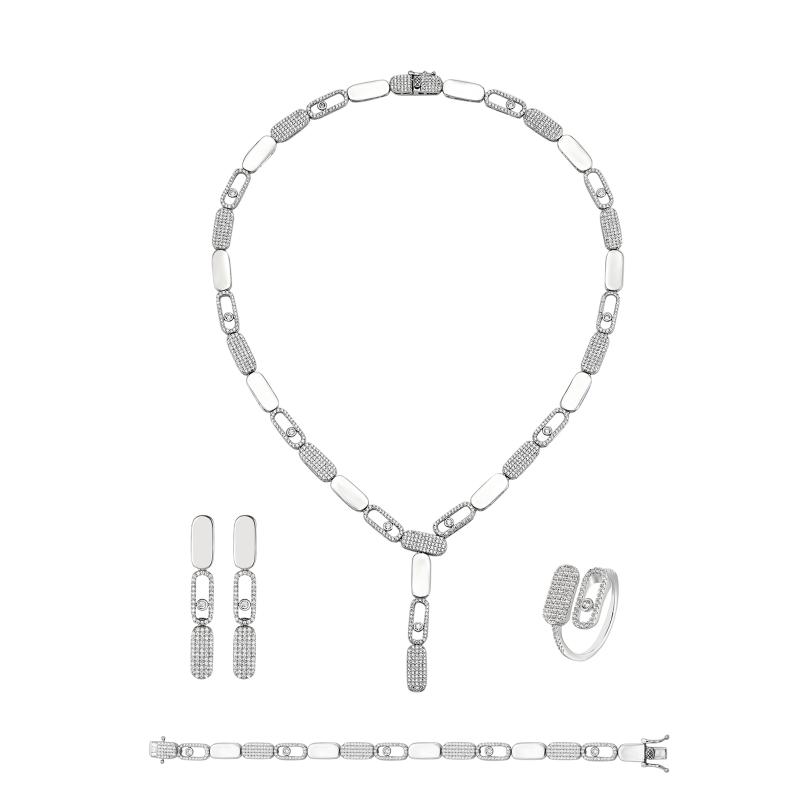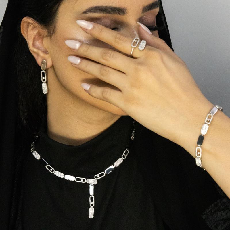ارتقي بمناسباتك الخاصة مع مجموعة المجوهرات الكاملة والرائعة التي تضم قلادة وسوار وخاتم وأقراط. كل قطعة مزينة بأحجار الزركونيا المبهرة، مما يضيف لمسة من السحر والرقي إلى مجموعتك. سواء كان حفل زفاف، أو حفل، أو أي حدث آخر لا يُنسى، فإن هذه المجموعة مصممة لتجعلك تتألقين وتميزين.