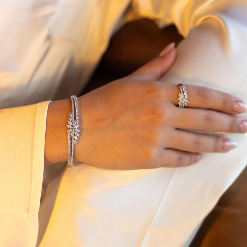 مجموعة إكسسوارات أنيقة للمناسبات، تحتوي على سوار مزين بأحجار الزركونيا، مرفقة بخاتم مطابق. مثالية لإضافة لمسة من التألق إلى أي ملابس للمناسبات الخاصة